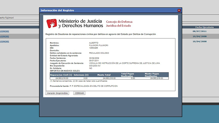 Alberto Fujimori le debe al Estado 51 millones de soles en reparación civil