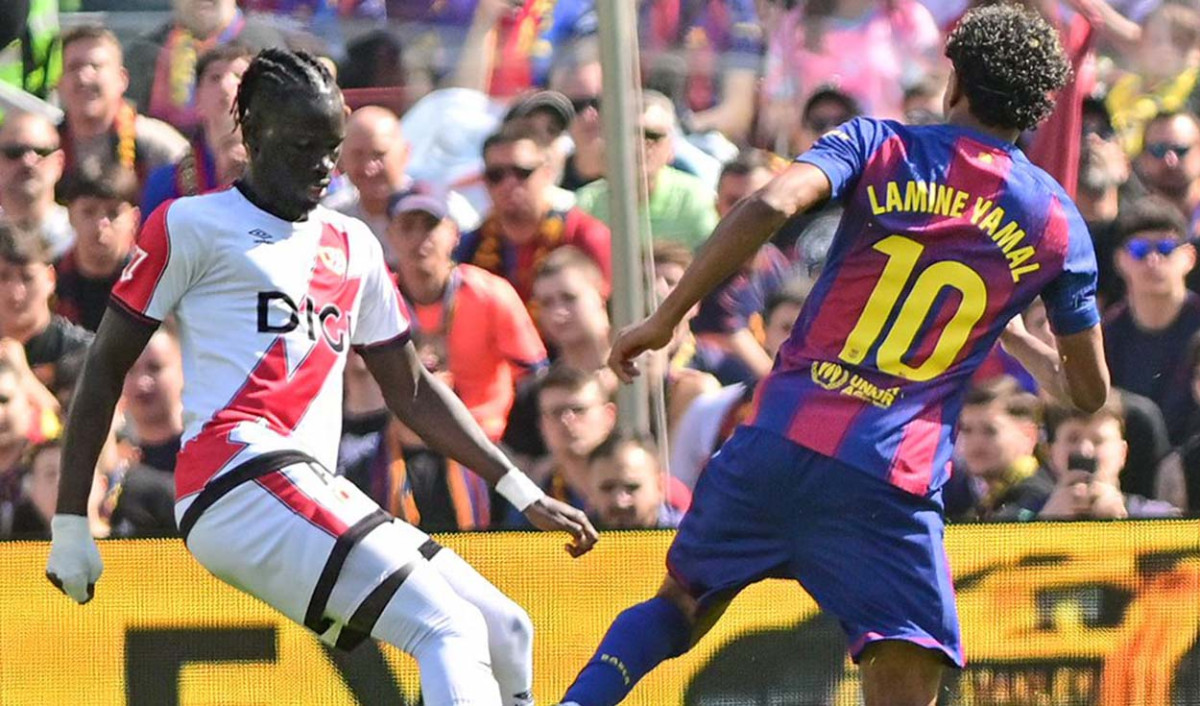 Minuto 67. Pathé Ciss cortó con falta el avance de Lamine Yamal y se convierte en el tercer amonestado del Rayo.