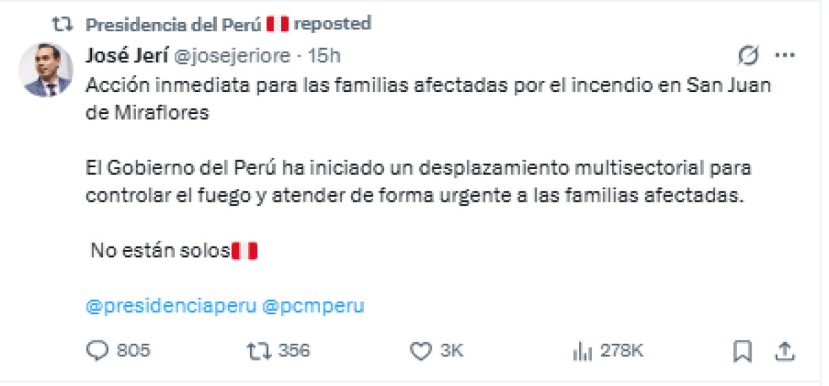 A través de sus redes sociales, el presidente José Jerí informó que acudió a las zonas afectadas por el incendio en San Juan de Miraflores. Sin embargo, realiza gestiones pese a que no cuenta con ministros y un premier para realizar de los trabajos de los diversos sectores del Perú.