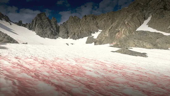 La nieve rosa, sangre de glaciar o conocida también como nieve de sandía, es un fenómeno natural que tiñe de color rojo o rosado la nieve. Es causado por la presencia de un alga microscópica llamada Chlamydomonas nivalis.