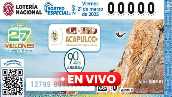 Consulta todos los resultados del Sorteo Especial 297 de la Lotería Nacional de México HOY, viernes 21 de marzo. Un gigantesco premio mayor de 27 millones de pesos fue repartido en el sorteo que se llevó a cabo en Acapulco, en homenaje a los 90 años de La Quebrada. Asimismo, fueron repartidos varios otros millonarios premios.