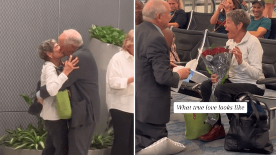 Tras el esperado encuentro, el hombre de 79 años de edad, llevó a su gran amor a las sillas de espera del aeropuerto con el fin de proponerle matrimonio a la mujer de 78 años.