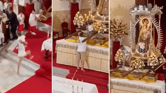 Un hombre sorprendió a todos los presentes en una iglesia de la isla Tenefire, la isla de Canarias más grande de España, durante una misa en honor a la Virgen del Carmen este fin de semana: ingresó corriendo con un niño en brazos para trepar sobre uno de los altares principales y colocarlo a los pies de la virgen.