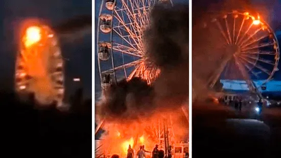Imágenes difundidas por la prensa mostraron una densa humareda negra emanando de dos barquillas en llamas en la parte alta de la rueda. Foto: Captura/X.