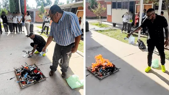 Las fotografías publicadas mostraban a los docentes utilizando un martillo para destruir los celulares y, posteriormente, quemándolos con gasolina. "También llevamos a cabo la quema y destrucción de artículos decomisados que se encuentran prohibidos en el reglamento escolar", indicó Hilda Patricia Ortega, directora de la escuela, en la publicación que posteriormente fue borrada de la red social.