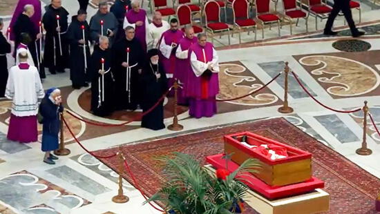 Durante el funeral público en la basílica de San Pedro, Jeanningros se acercó al féretro del papa, permaneciendo allí durante siete minutos. Foto: Vatican Media