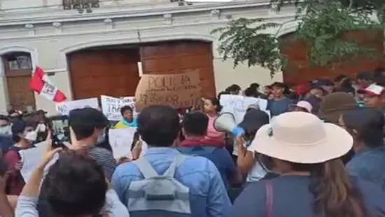 Alumnos de la Universidad Nacional Mayor de San Marcos exigen, en los exteriores de la Drincri, la libertad de los manifestantes detenidos por la Policía Nacional del Perú. Los protestantes provenientes de diferentes regiones del Perú fueron intervenidos por la PNP en el interior de la UNMSM.