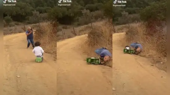 En el video viral de TikTok se puede observar a un niño jugando mientras que su abuelo intenta grabarlo y tomarle varias fotos. Cuando el menor se va acercando, el hombre intenta también aproximarse para capturar mejor el momento, aunque sin percatarse del desnivel del suelo.