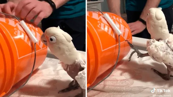 El clip compartido por el usuario @birds_love5 mostró a una pequeña ave con plumaje blanco que estaba al lado de su dueño sobre una mesa. El joven comenzó a tocar con sus uñas el balde de plástico y el emplumado animal de inmediato copiaba todos sus movimientos.