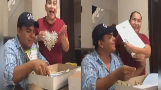Le añadió un lazo para hacer más emocionante el momento. Cuando juntó a sus padres para darles el obsequio, ellos fueron abriendo el empaque poco a poco, hasta que se dieron con la grata sorpresa.
