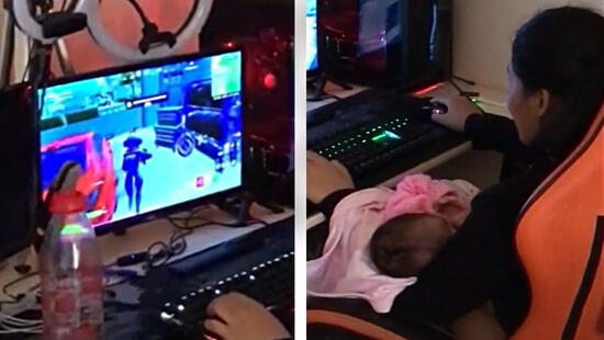 En la secuencia de imágenes se observa a una mamá dando de lactar a su bebé mientras juega Fornite. “La habilidad, ¿no? Está dando de lactar y se está metiendo una partida”, comenta el papá de su hija, lo que la mujer afirma entre risas. Está tan concentrada en ganar que ni voltea a la cámara cuando su pareja graba.