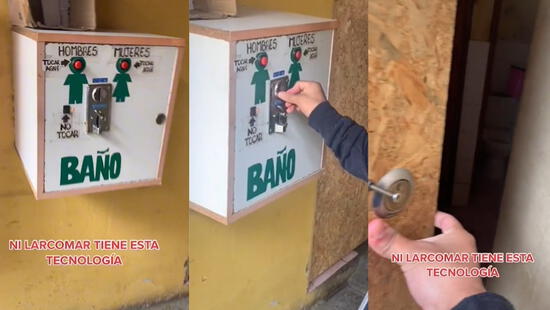 Como muestra el clip, los jóvenes se encuentran frente al objeto que parece una caja con instrucciones, botones rojos, dibujos y compartimentos. El último mencionado sirve para colocar el dinero y así poder ingresar tanto al baño de mujeres como al de hombres.