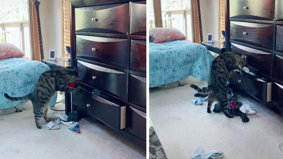 El clip viral muestra las entretenidas imágenes de un gato que simula que está buscando algo mientras sustrae las medias de sus cuidadores, lo que sorprendió más a los internautas fue el afán que el minino dedicaba a la escena ya que, se observa que en un momento fijo se vuela por los aires una de las prendas.
