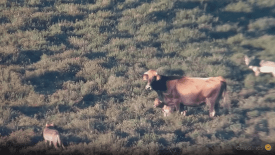 Fueron muchos los intentos de ambos lobos, ya que incluso la rodearon tratando de atacarla por ambos frentes, pero el bovino se mantenía incólume junto a su cría. Después de unos minutos intensos, los cazadores desistieron el ataque y huyeron del lugar.