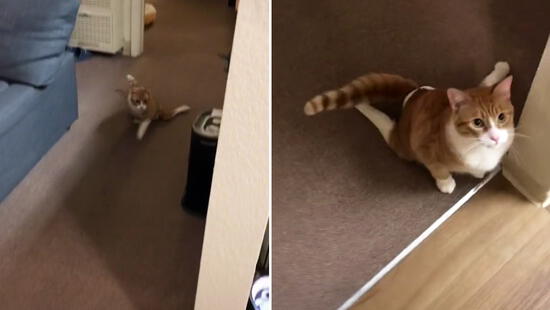 En las imágenes, su dueño está moviendo un recipiente de comida para felinos con la intención de que lo oiga George, segundos después, el pequeño minino ‘corre’ hacia el área de la cocina.