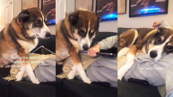 “Murphy cuando finalmente apago mi laptop en todo el día”, escribe la dueña del tierno can al percatarse de la intención de este. Por ello, la joven desconectó el aparato electrónico y lo alejó del sofá para que su engreído ocupe su lugar.