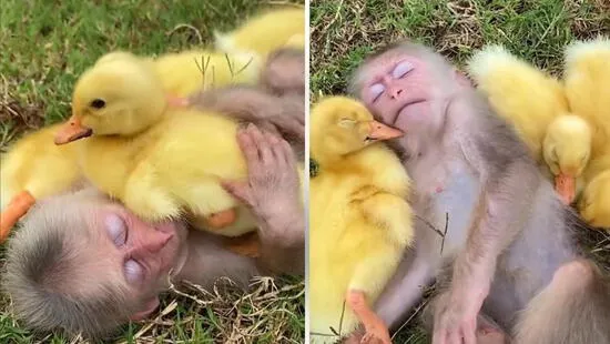 En otra escena se observó que unos cinco patitos se colocaron al rededor del primate y uno por uno se empezaron a acurrucar en él hasta quedarse dormidos. Cuando el mono se dio cuenta, pasó su brazo por encima del cuerpo de uno de los patos que se acomodó en su pecho para dormir.
