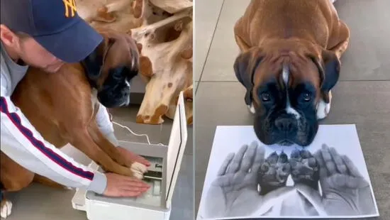 La secuencia de imágenes compartidas por la cuenta @MustLuvBoxers Rescue, fue protagonizada por un perro de raza bóxer, quien junto a su dueño colocó sus dos patas encima del scanner de una impresora. El hombre que se encuentra detrás suyo coloca las funciones para que el aparato empiece a imprimir.