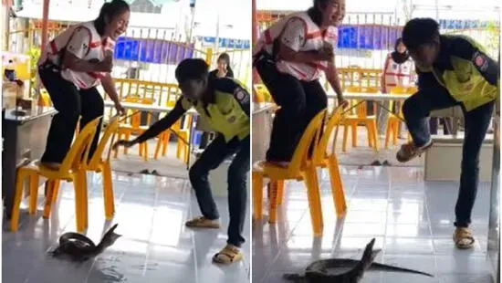 La grabación muestra a una aterrorizada fémina parada en una silla y gritando de miedo después de ver a un lagarto monitor dentro de un restaurante en Tailandia.