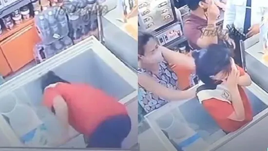 En las imágenes compartidas por la cuenta @mjcruz04 se puede observar cómo la mujer se acerca a la congeladora del establecimiento donde trabajaba para atender el pedido de un cliente, pero al estirarse demasiado dentro del aparato electrónico terminó dentro de este.