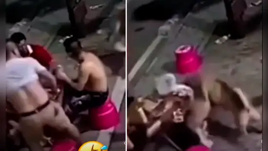 Las mascotas de este nuevo viral comenzaron una pelea en medio de la calle, junto a un grupo de hombres que libaban licor sentados en una mesa. De un momento a otro, los peluditos comenzaron a reñir dejando asustados a los muchachos que se pararon rápidamente para evitar que los cuadrúpedos terminaran mordiéndolos.