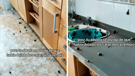 Cuando la mujer finalmente recordó la presencia de los caracoles, fue recibida por una escena que desafió toda expectativa. Su nieta, quien grabó el momento, se encontró con una cocina invadida por estos pequeños animales, esparcidos por todas partes: en el suelo, la mesa, el repostero e incluso trepando por los muebles altos.