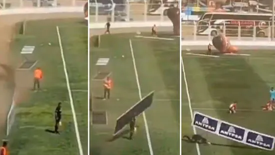 Jorge Ramírez, segundo asistente del partido, cayó al suelo tras ser impactado por la estructura que un ventarrón mandó por los aires en el estadio Los Chankas. Afortunadamente, no sufrió mayores daños.