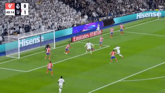Kylian Mbappé apareció dentro del área luego de un rebote tras remate de Bellingham y empata el partido ante Atlético Madrid. La jugada la inició Rodrygo por la banda derecha.