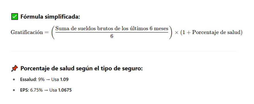 Para calcular correctamente la gratificación, se deben considerar los ingresos brutos (es decir, el sueldo sin aplicar descuentos como AFP) correspondientes a los meses trabajados. La suma de estos ingresos se divide entre seis. Al resultado obtenido se le añade un porcentaje adicional, el cual varía según el tipo de seguro de salud al que esté afiliado el trabajador. Este procedimiento determina el monto final de la gratificación. A continuación, te compartimos el siguiente esquema: