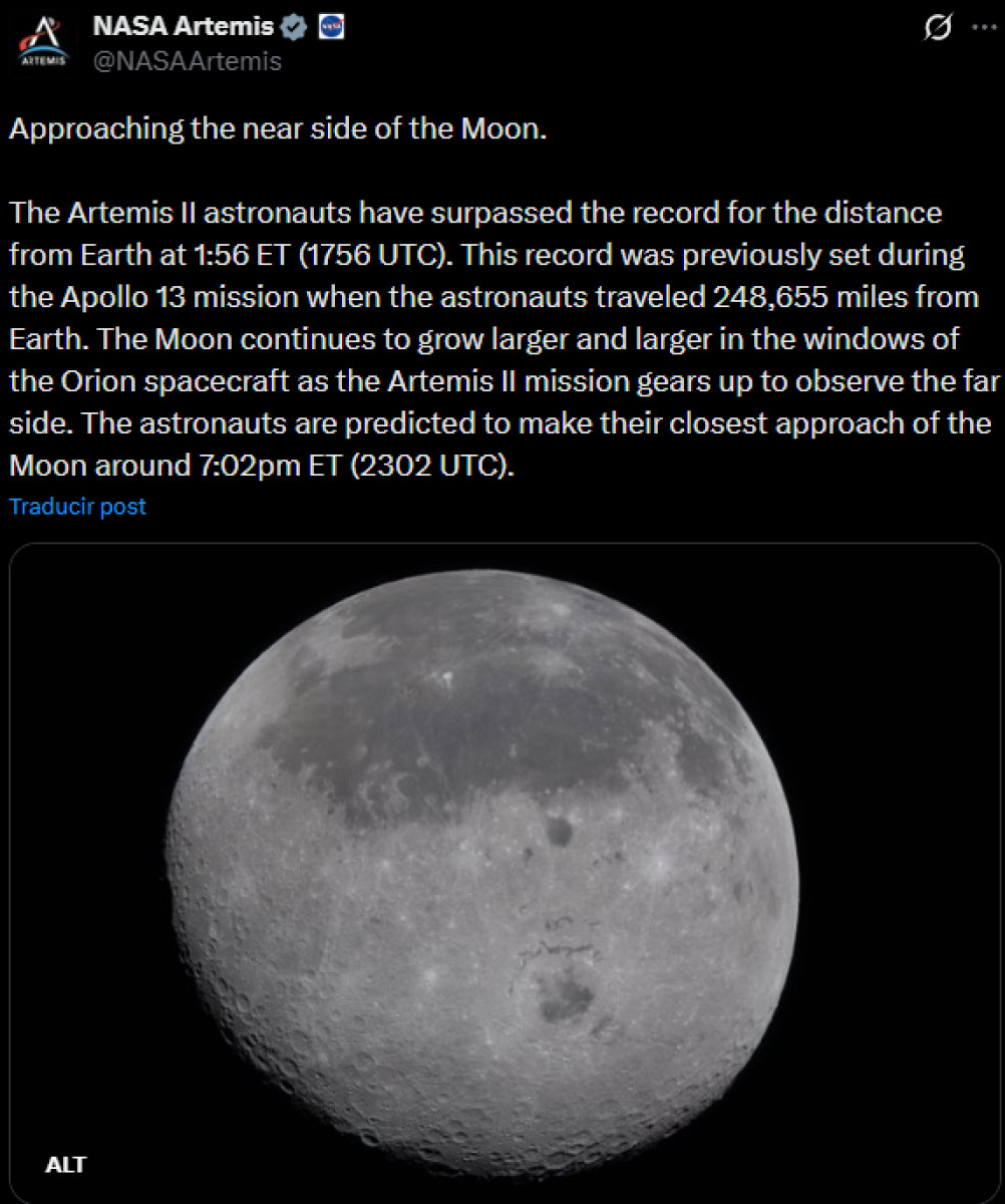La tripulación de la misión Artemis II hizo historia esta tarde al convertirse en los humanos que han viajado más lejos de la Tierra. A bordo de la nave espacial Orión, superaron el récord de distancia del Apollo 13, que alcanzó los 400.170 kilómetros desde la Tierra, marca establecida en 1970.