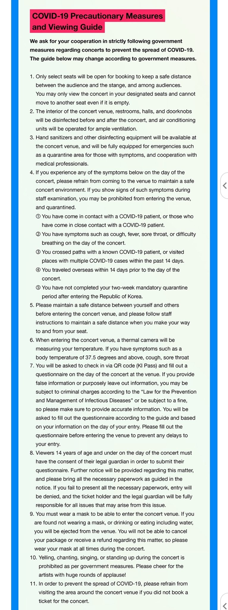 Aunque en las reglas para el público se detalla que está prohibido cantar, queda esperar a próximas indicaciones de la empresa. Por otro lado, los tickets para la transmisión online aún no están a la venta y se desconoce el precio de ellos.