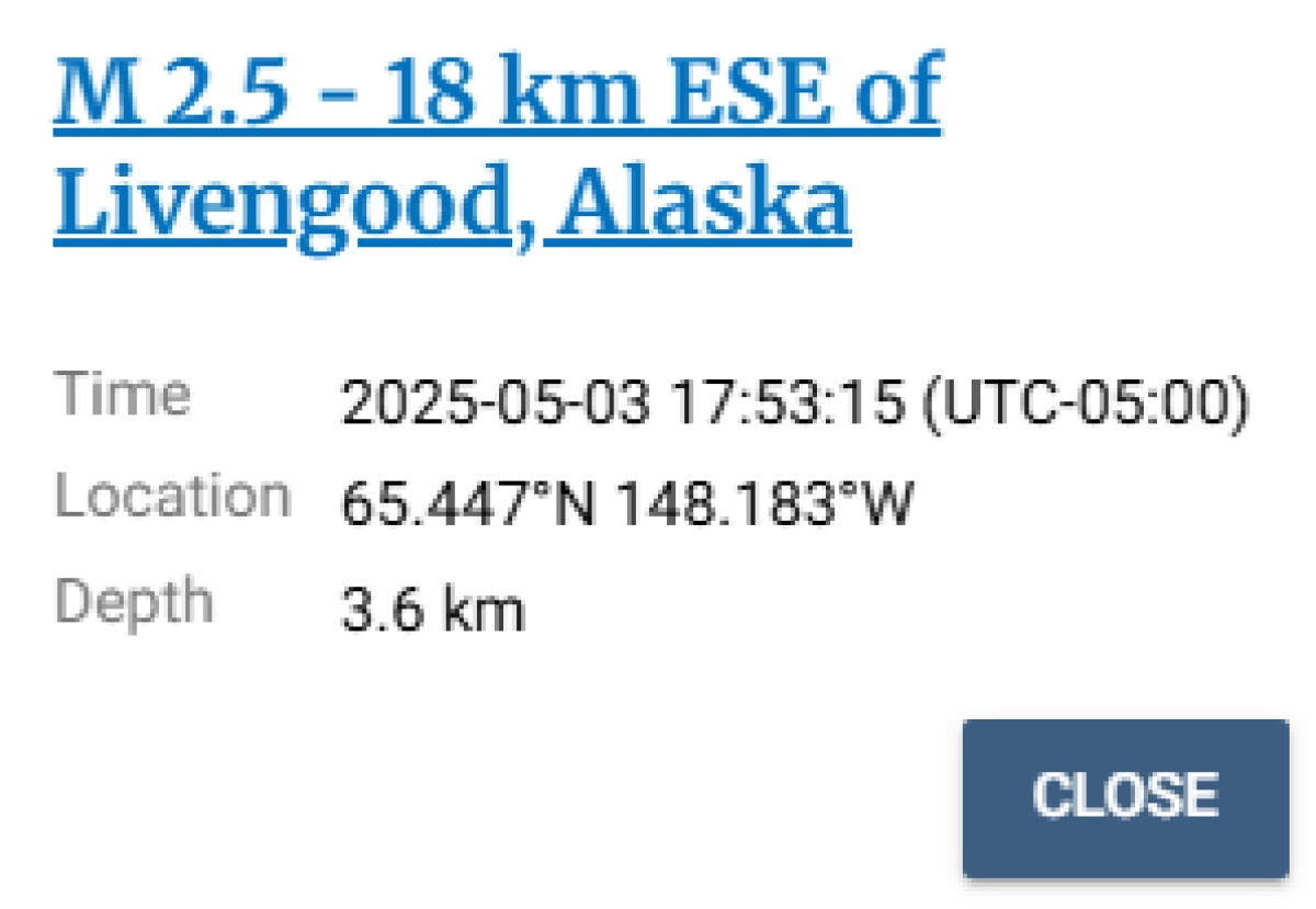 Último sismo reportado en Livengood, Alaska, según USGS.