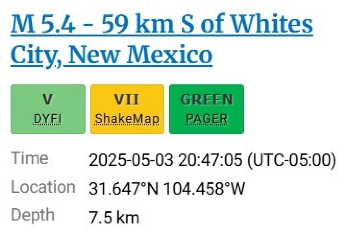 USGS reportó un sismo de 5.4 en White City, Nuevo México, este sábado 3 de mayo de 2025. El temblor ocurrió a las 8:47 p. m. hora local. Este sismo se sintió en otros estados como Texas.
