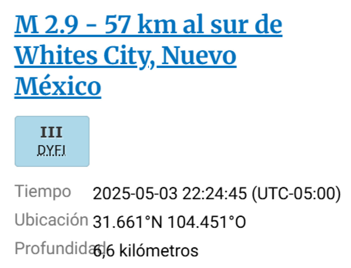 USGS reportó un nuevo sismo de 2.9 en Whites City, Nuevo México, este sábado 3 de mayo de 2025. El temblor ocurrió a las 10:24 p. m. hora local.
