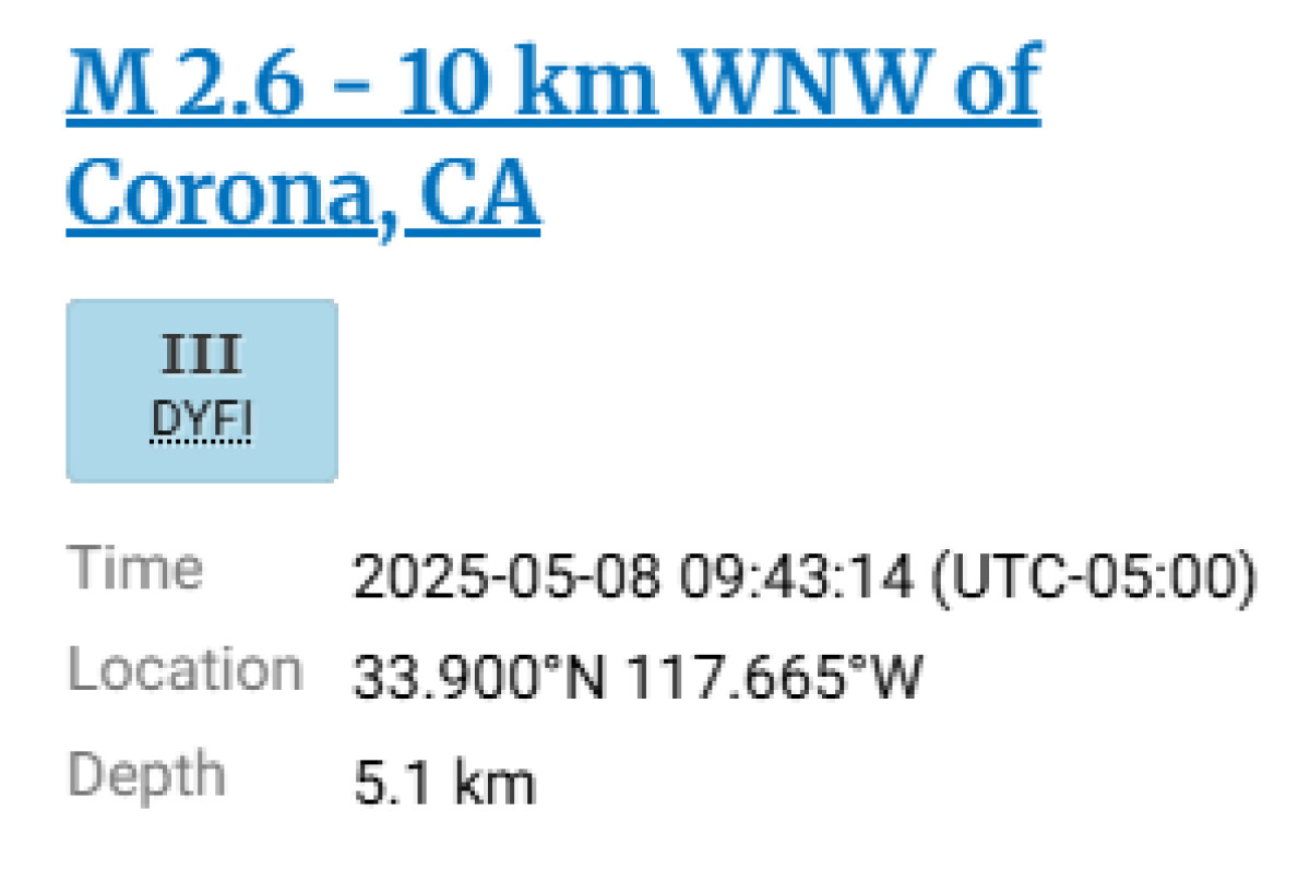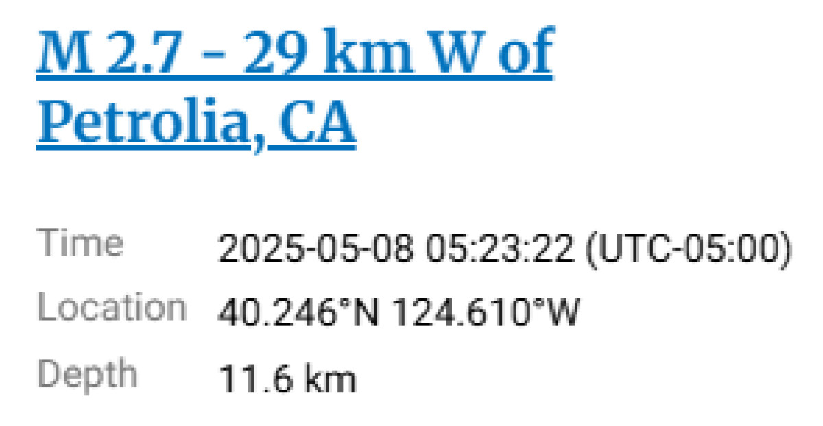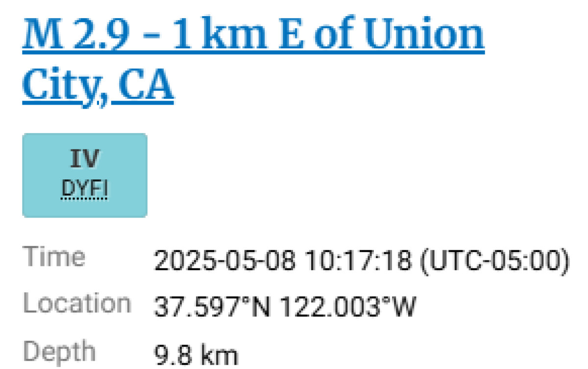 Hoy, 8 de mayo de 2025, el Servicio Geológico de Estados Unidos (USGS) reportó un temblor de 2.7 en California.