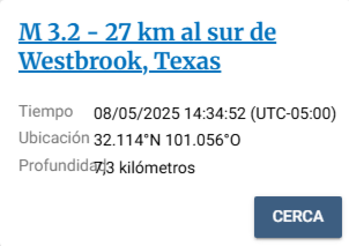 El jueves 8 de mayo de 2025, la agencia federal responsable de supervisar la actividad sísmica en tiempo real, el Servicio Geológico de Estados Unidos (USGS), emitió alertas sobre los terremotos acontecidos en el día de hoy.