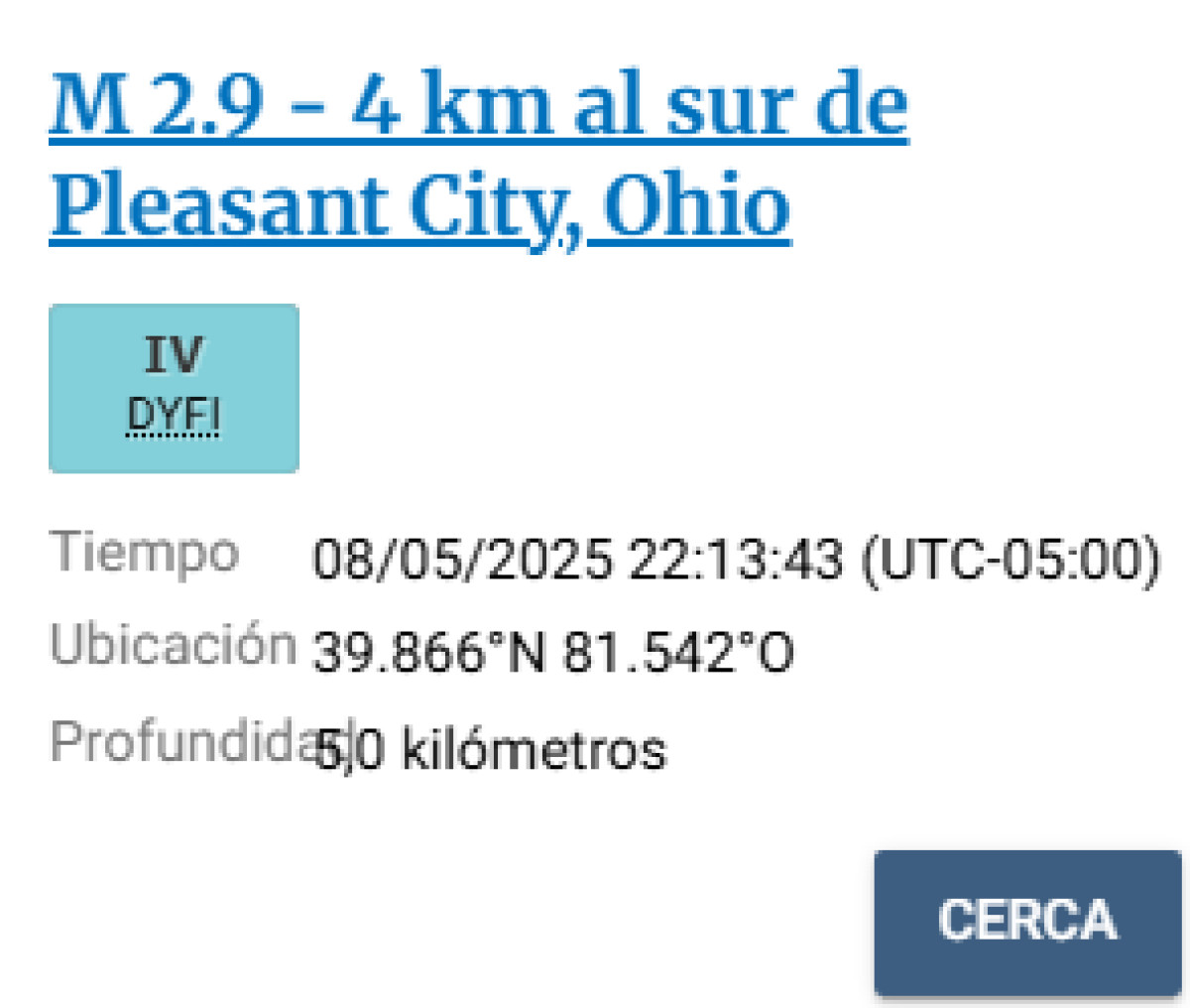 USGS reportó un movimiento de telúrico en Ohio, de una magnitud de 2.9