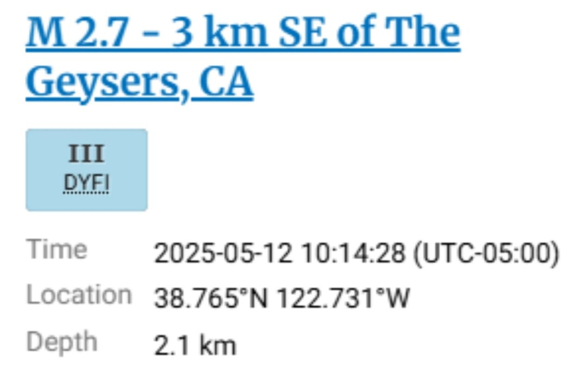 El último sismo fue en Geyser, California a las 10:14 h. con 2.1 km de profundidad.