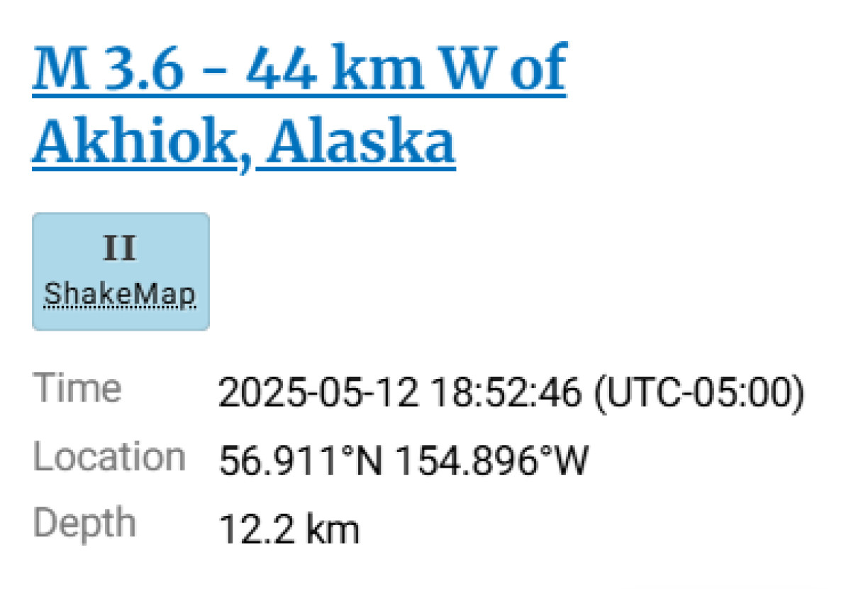 Este lunes 12 de mayo se registró un sismo de 3.6 al oeste de Akhiok, Alaska, a las 18.52 p. m., según el USGS:
