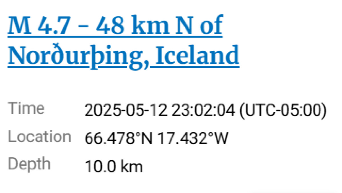 Este lunes 12 de mayo se registró un sismo de 4.7 al norte de Norðurþing, Iceland, a las 23.02 p. m., según el USGS: