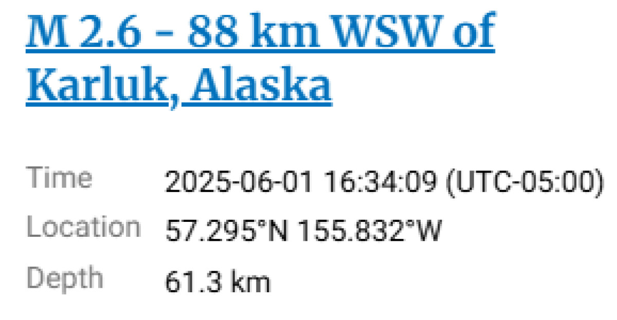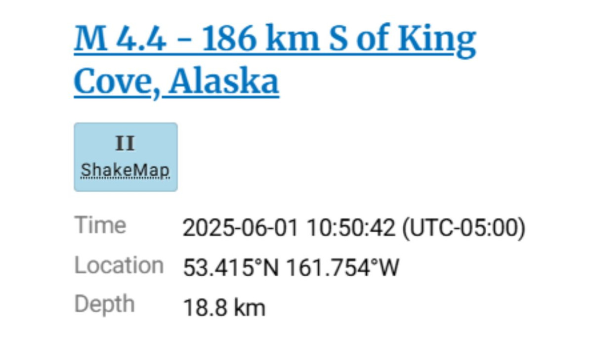 Hoy, 1 de junio de 2025, el Servicio Geológico de Estados Unidos (USGS) reportó un temblor de 4.4 en King Cove, Alaska.