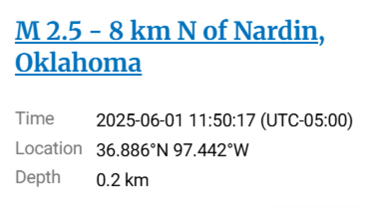 Hoy, 1 de junio de 2025, el Servicio Geológico de Estados Unidos (USGS) reportó un temblor de 2.5 en Nardin, Oklahoma: