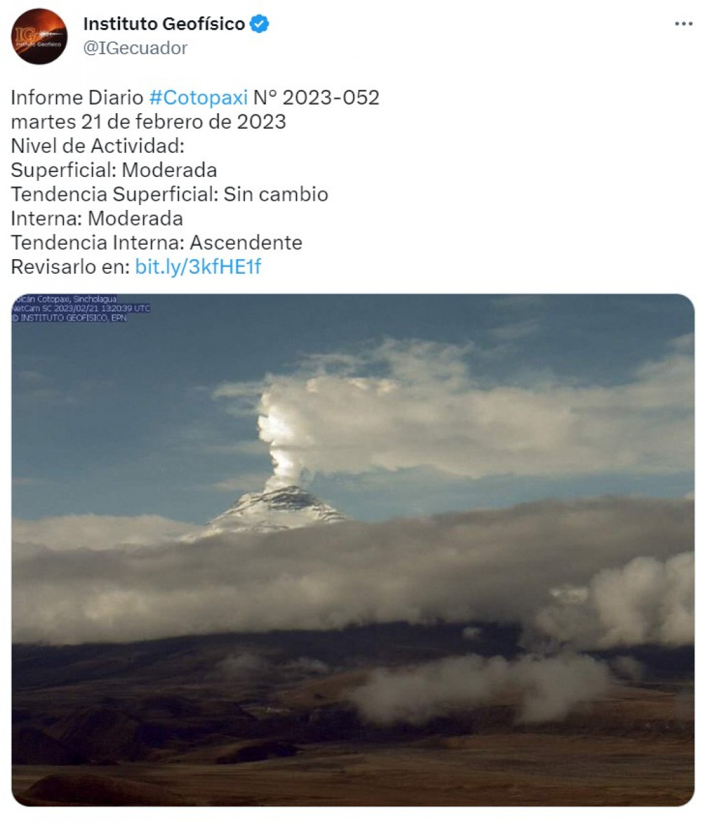 El Volcán Cotopaxi y Sangay han registrado un leve incremento en su actividad, sigue EN VIVO los reportes diarios del Instituto Geofísico de Ecuador (IGE), hoy 22 de febrero del 2023.