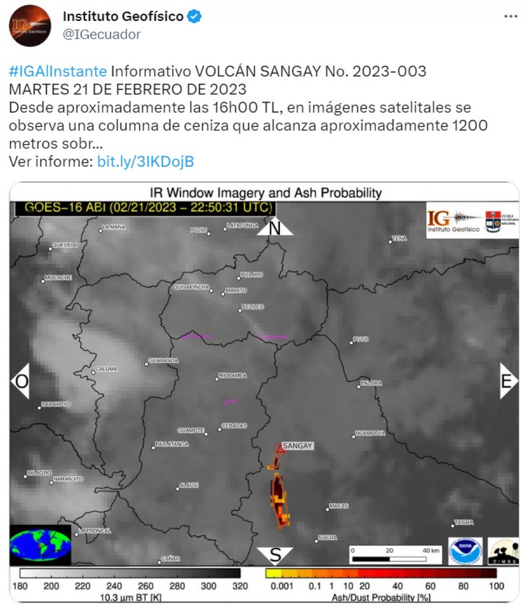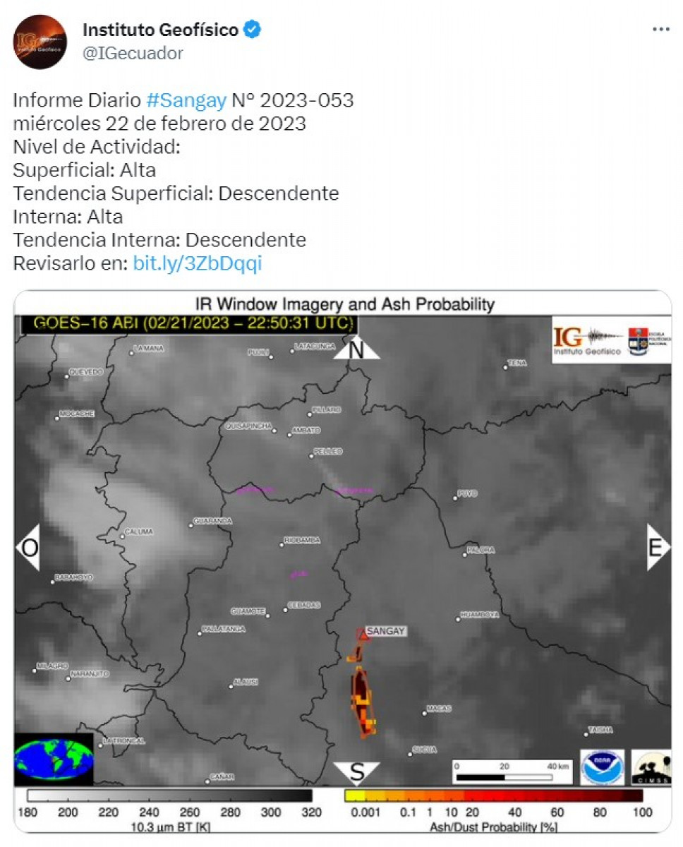 El Instituto Geofísico de Ecuador informó el martes 21 de febrero que, desde aproximadamente las 16.00 horas, en imágenes satelitales se observó una columna de ceniza que alcanzó aproximadamente 1200 metros sobre el cráter y que se dirigía hacia el sur del volcán Sangay. En ese sentido, esta emisión podría generar caída leve de ceniza en los sectores ubicados en esa dirección.