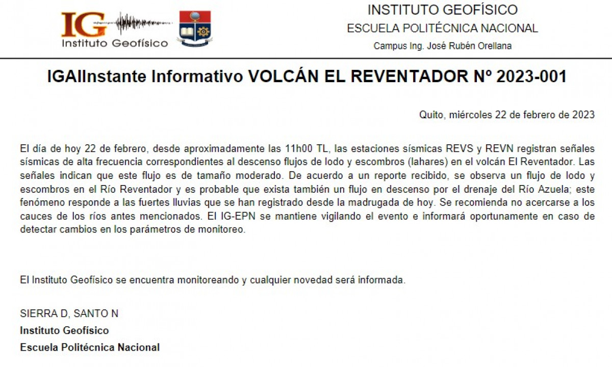 El día de hoy 22 de febrero, desde aproximadamente las 11:00 horas, se registran señales sísmicas de alta frecuencia correspondientes al descenso flujos de lodo y escombros en el volcán El Reventador. Asimismo, se observa un flujo de lodo y escombros en el río Reventador y es probable que exista también un flujo en descenso por el drenaje del río Azuela. Por ello, se recomienda no acercarse a los cauces de los ríos antes mencionados.