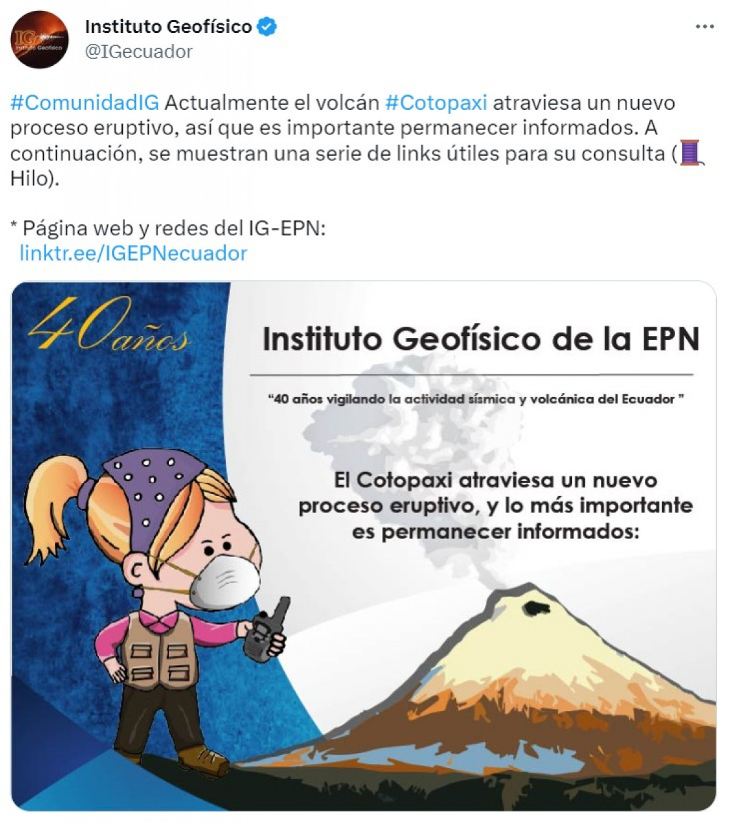 El IGE informa que el volcán Cotopaxi atraviesa un nuevo proceso eruptivo, por lo que es importante permanecer informados. Revisa AQUÍ los links útiles para consultar.