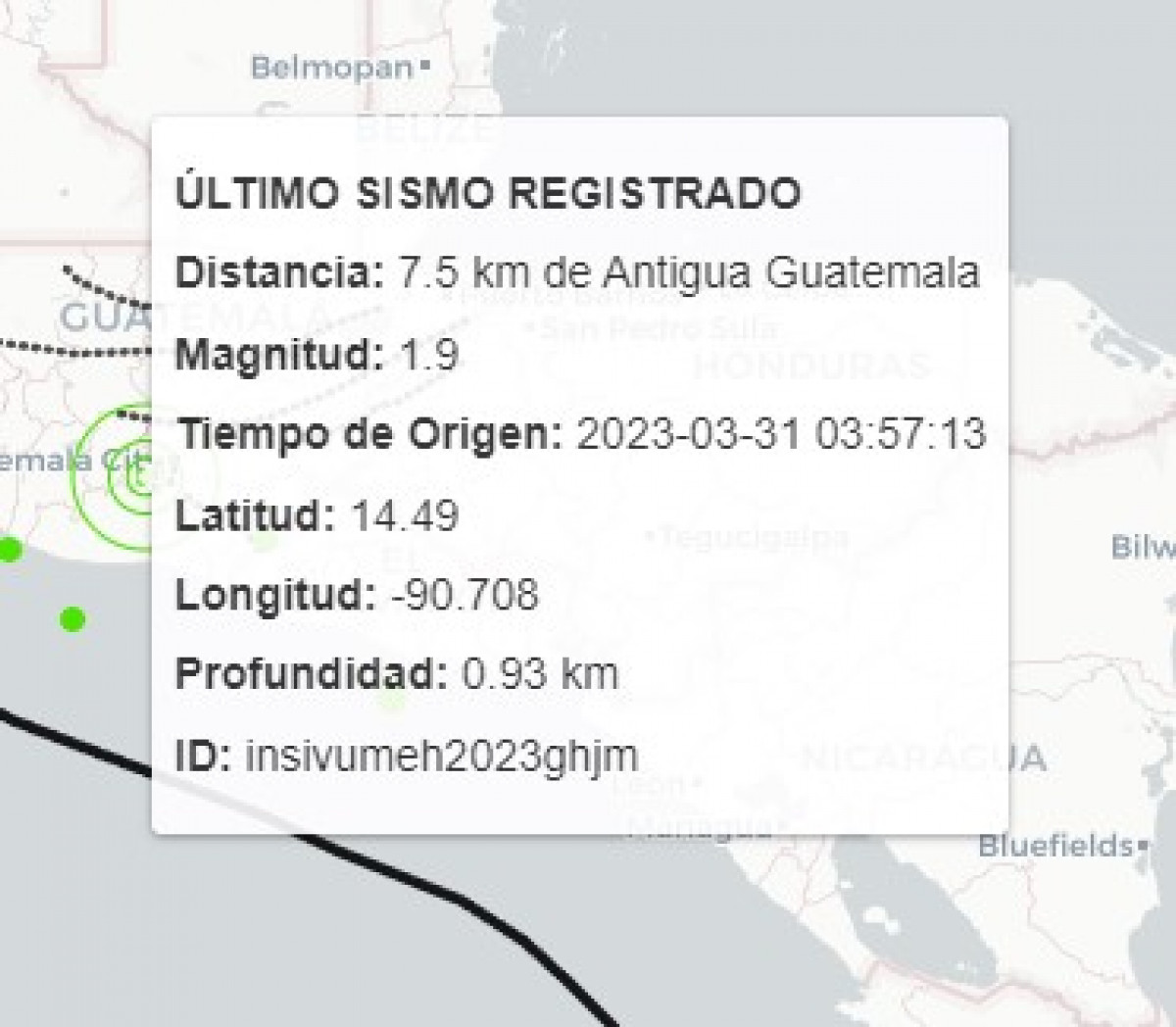 Hasta las 13.00 p.m., el último sismo registrado en Guatemala, según, INSIVUMEH, sucedió este viernes 31 de marzo, a las 03.57 horas a 7.5 km de Antigua Guatemala. El movimiento telúrico tuvo una magnitud de 1.9.
