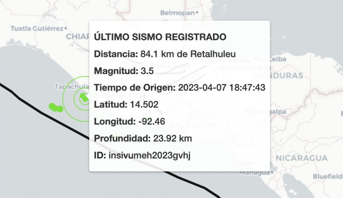 El último temblor registrado en Guatemala sucedió este 7 de abril, a las 18.47 horas a 84.1 km de Retalhuleu. El movimiento sísmico tuvo una magnitud de 3.5 y una profundidad de 23.92 km.