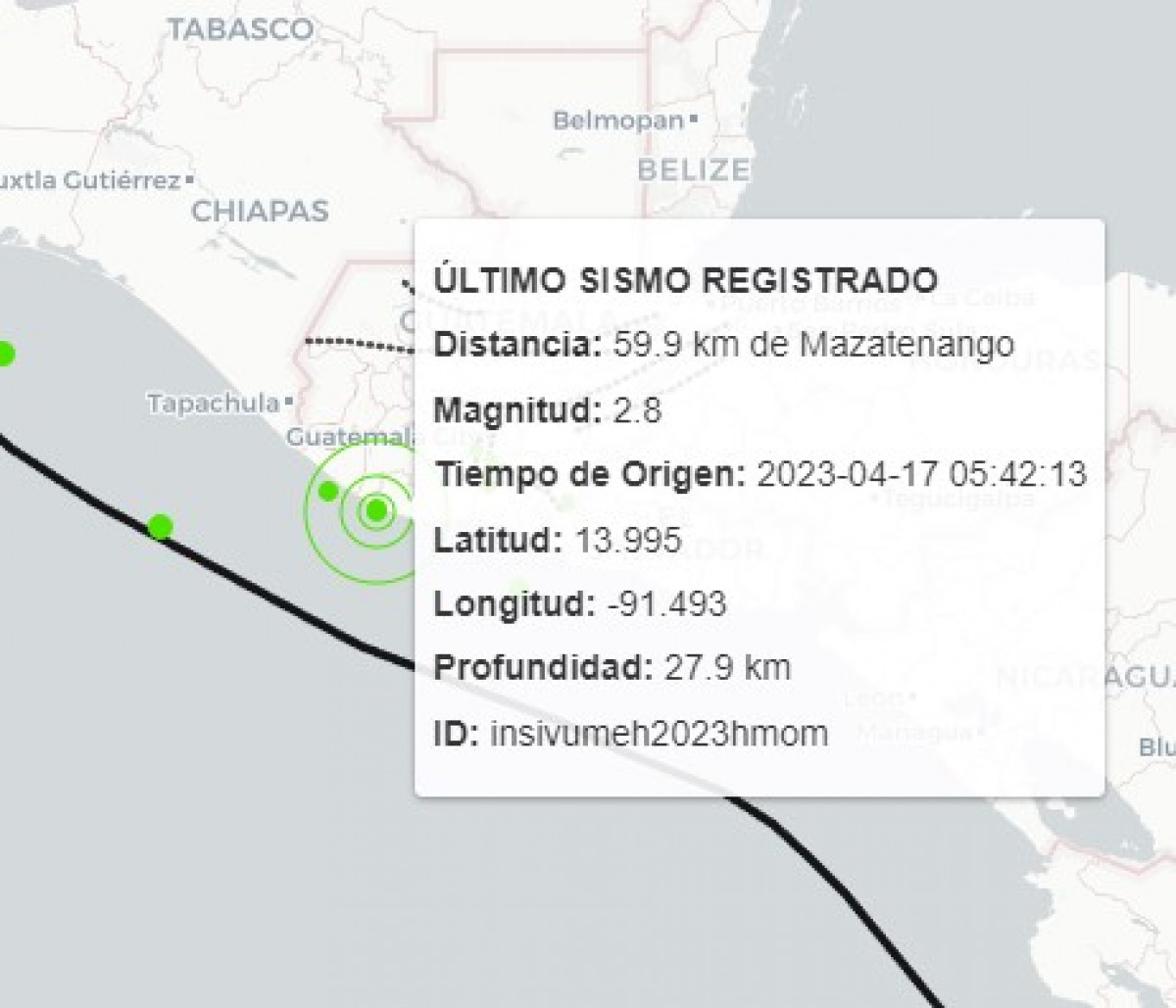 El último sismo sensible registrado en Guatemala sucedió este 17 de abril, a las 05.42 horas a 59.9 km de Mazatenango. El movimiento sísmico tuvo una magnitud de 2.8 y una profundidad de 27.9 km.