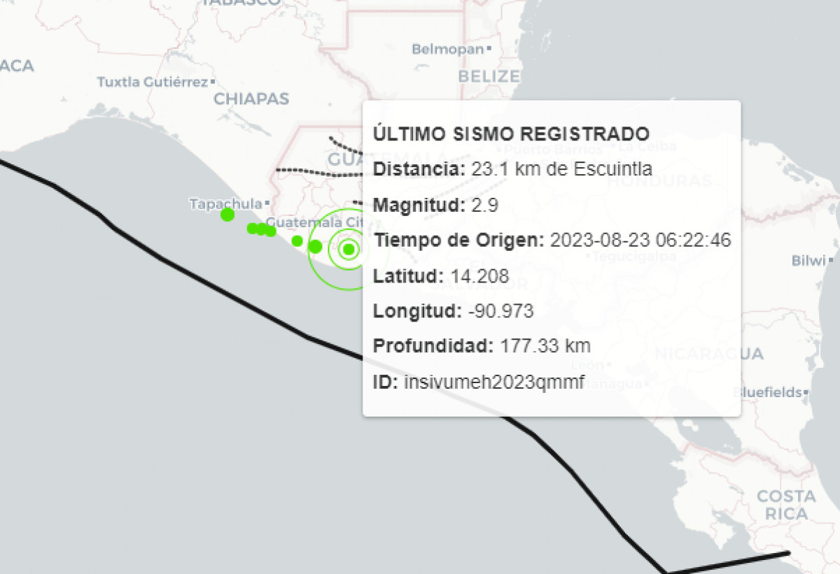 El último temblor registrado en Guatemala fue el 23 de agosto, a las 06:22 a. m., a 23.1 km de Escuintla. El movimiento sísmico tuvo una magnitud de 2.9 y tuvo una profundidad de 177.33 km.